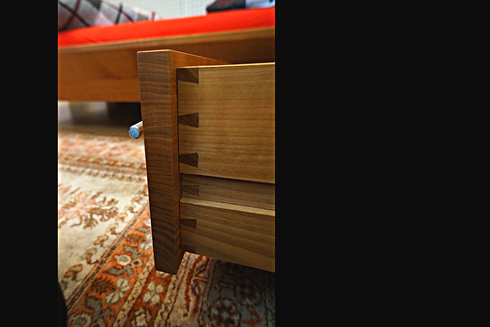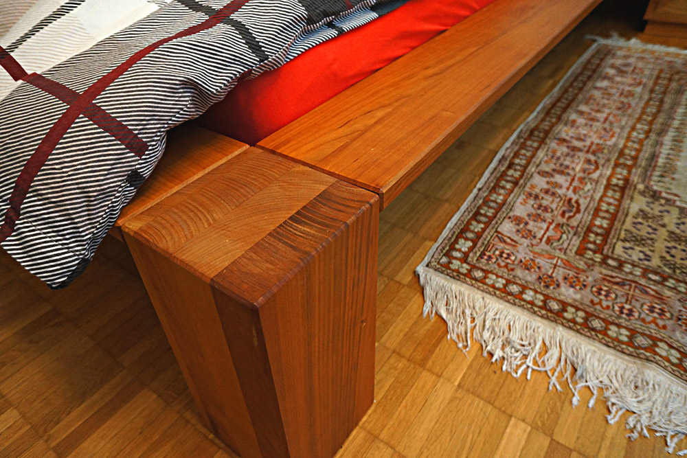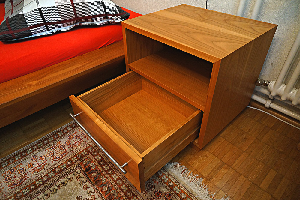 Das aus Kirschbaum gefertigte Schlafzimmer besteht aus einem Bett - Massivholz und in vier Teile zerlegbar - sowie einem furnierten Nachttisch mit schönen, massiven Schubladen.