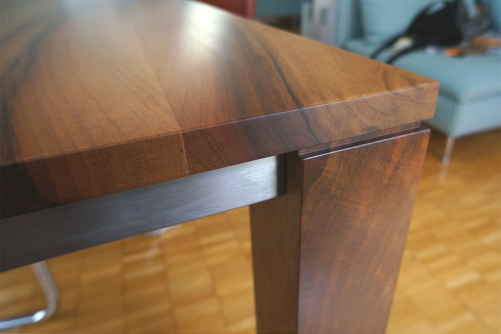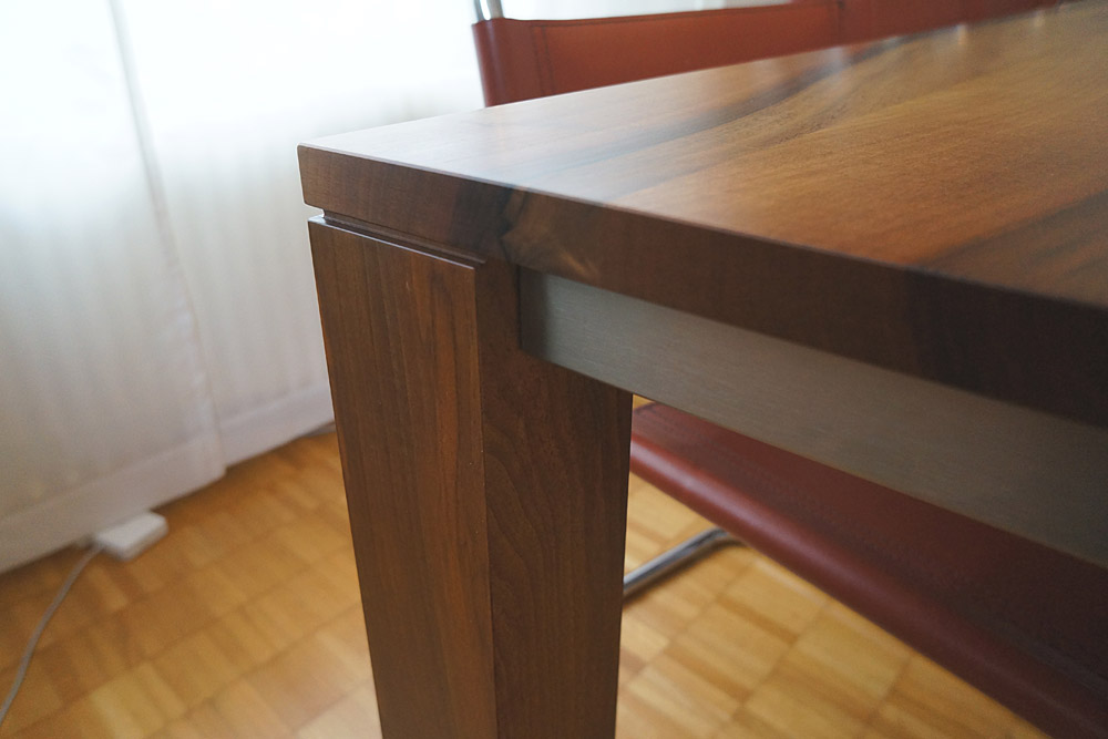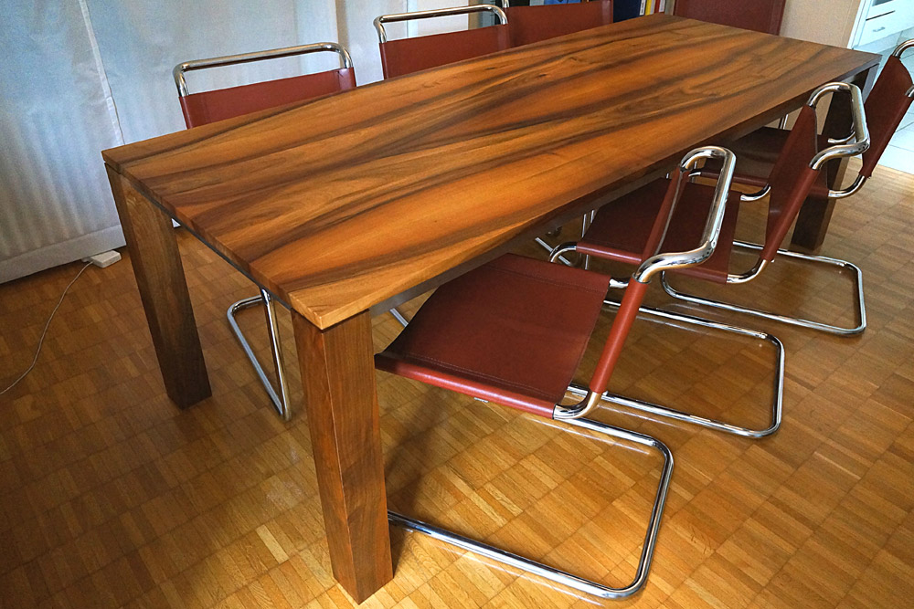 Der Blickfang des Tisches ist seine Platte mit der natürlichen Maserung des Holzes. Er wurde aus massivem Nussbaum und mit Chromstahltraversen angefertigt. Auf Wunsch ist er auch in anderen Materialien erhältlich.